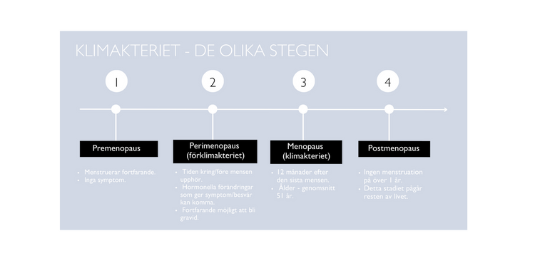 När det gäller klimakteriet ger östrogennivåerna oss många svar på symptomen vi får och vad som händer med kroppen. Klimakteriet innebär kvinnans sista menstruationsblödning, men symtomen kan börja flera år innan, vilket kallas premenopaus. Det följs av perimenopause, tiden runt klimakteriet. Klimakteriet ersätts av postmenopausen som varar livet ut.
