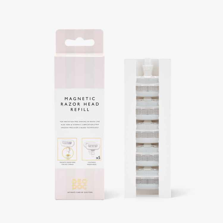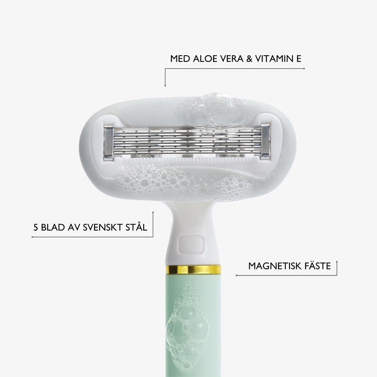 Rakblad speciellt designade för intimområdet. Med 5 blad av svenskt stål och avancerad precisionsteknologi fås en nära och skonsam rakning. Bladens remsa är berikad med Aloe Vera och vitamin E som verkar lugnande på huden. Det magnetiska fästet gör rakbladsbytena smidiga och säkra.