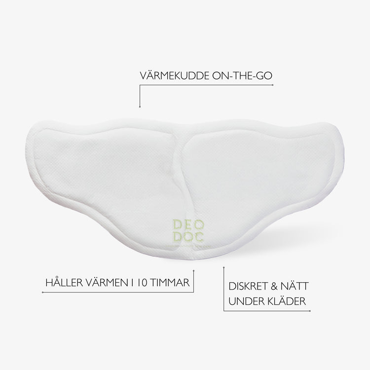 En värmekudde on-the-go som ger avslappnande värme (ca 40°) för mensvärk i upp till 10 timmar. Består av naturliga ämnen som vid kontakt med syret i luften utvecklar värme inom någon minut. Det tunna materialet gör att plåstret diskret bärs under kläder och lätt fästs på trosor, linne, t-shirt eller byxor.