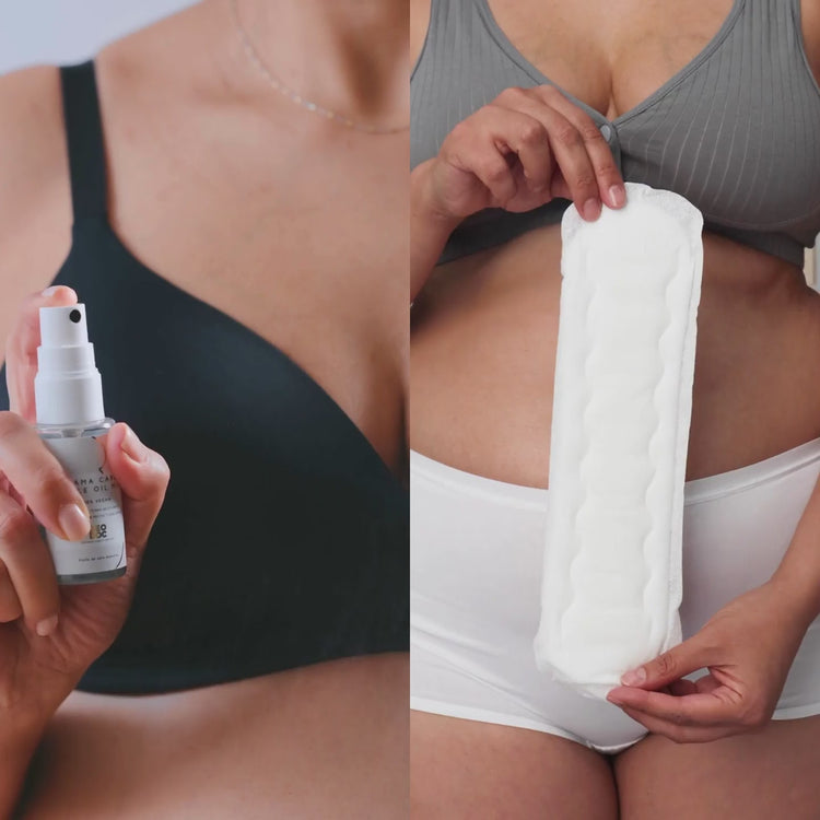 Förlossningsbindor: Ytskikt: 100 % ekologisk bomull. Kärna: naturligt cellulosamaterial.