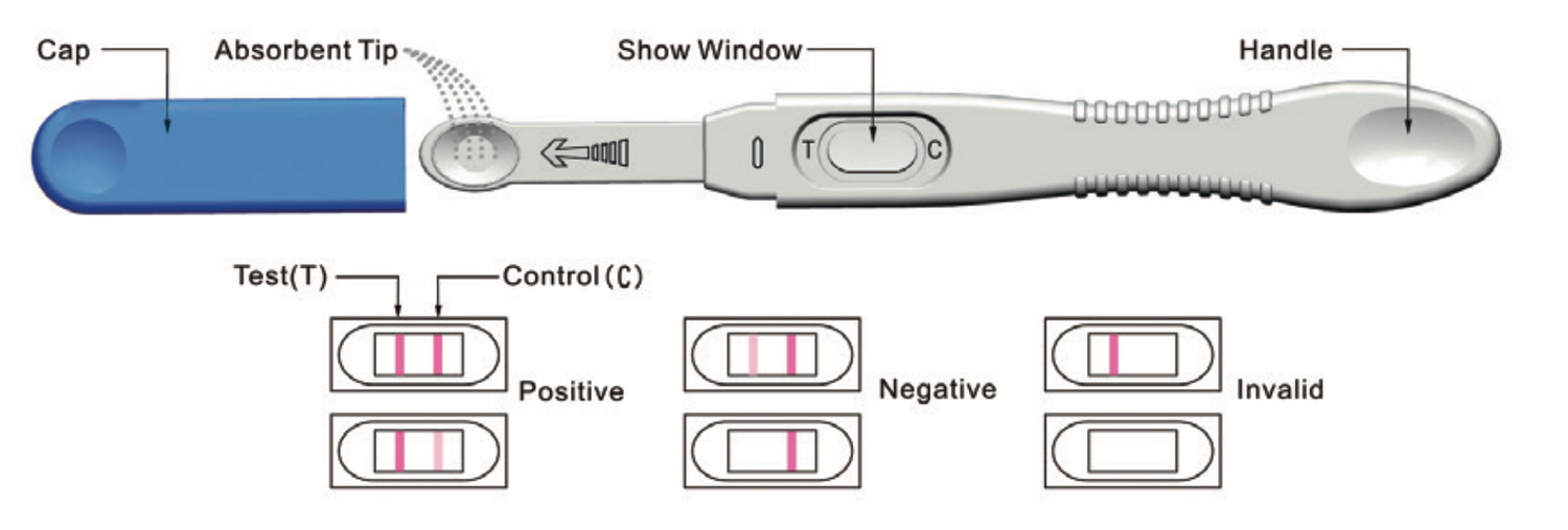 2.NEGATIVT: Endast ett färgat streck syns på kontrollinjen (C), eller testlinjen (T) visas men är ljusare än kontrollstrecket. Detta indikerar att FSH-koncentrationen i urinprovet är under 25 m IE/ml. 3.OGILTIGT: Om du inte ser någon kontrollinje (C) efter 10 minuter, eller endast en testlinje (T) (eller inga streck alls) - då är resultatet ogiltigt och ett nytt test bör utföras. Kontrollera att du har följt bruksanvisningen.