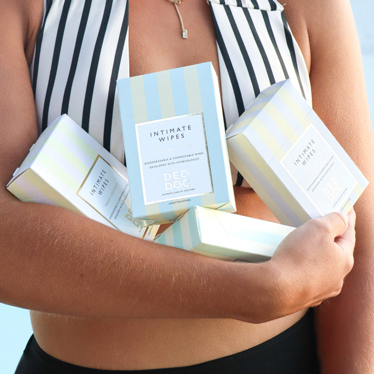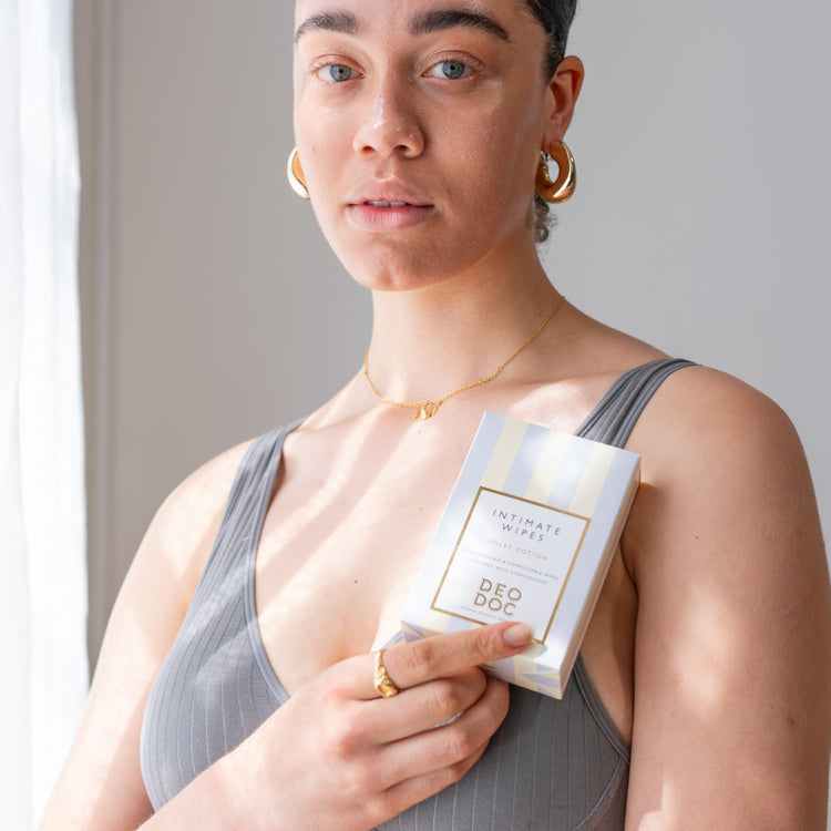 "Intimområdet har kroppens känsligaste och tunnaste hud med ett delikat pH-värde som lätt kan sättas ur balans. Våra Deowipes är fria från allergener, parabener och eteriska oljor, De innehåller mjukgörande olivolja, aloe vera & vitamin E - perfekta att använda när du är på språng."