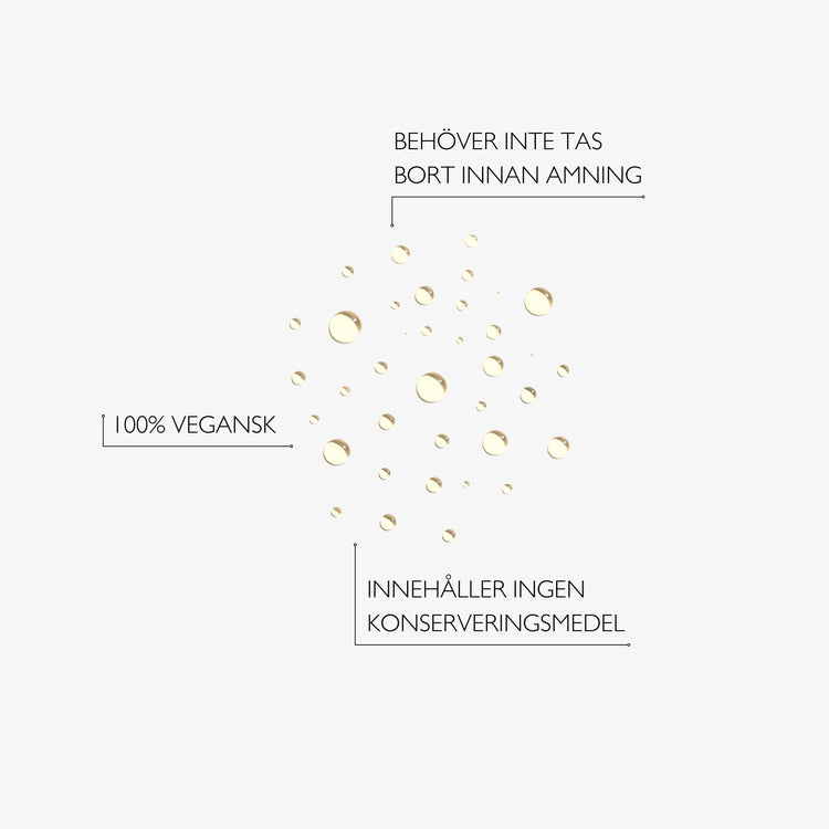 "När barnet lär sig amma, är det vanligt med såriga och ömma bröstvårtor. Om såren inte läks finns en ökad risk för infektion, speciellt när bröstvårtorna smörjs med fingrarna. Därför utvecklade vi en hygienisk oljemist som lämnar ett tunt lager av olja på bröstvårtorna som lugnar, återfuktar och skyddar den skadade huden. Oljan är självklart doft-och smakfri för barnet och behöver inte torkas bort innan amning."