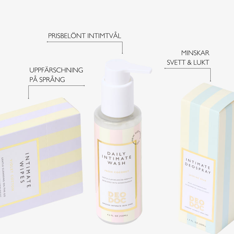 Få alla dina DeoDoc favoriter i ett kit! Här är DeoDocs bästsäljande Intimtvål, Intimservetter och Deo Intimspray samlade med ett kitpris.